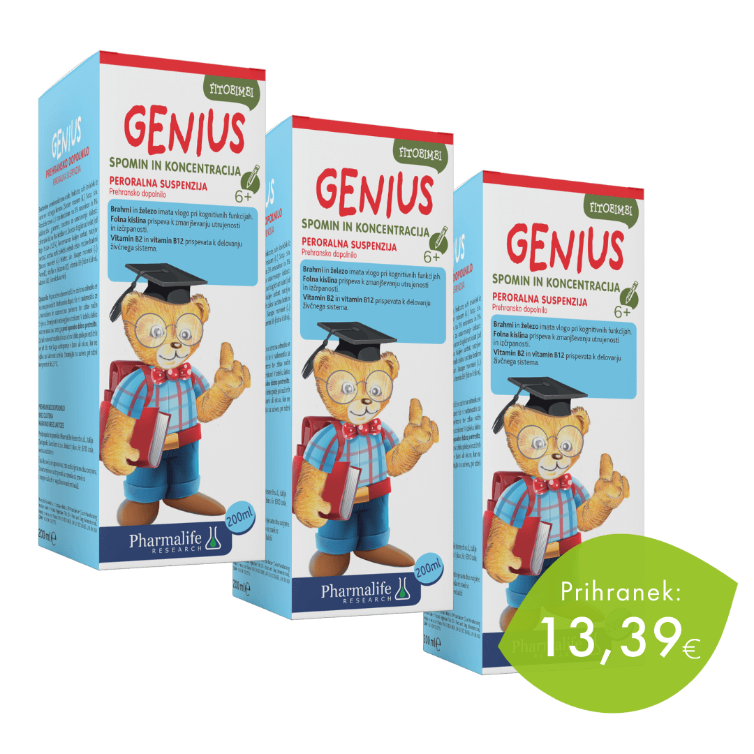 Fitobimbi Genius je prehransko dopolnilo na osnovi rastlinskih izvlečkov brahmija, ki ima vlogo pri kognitivnih funkcijah ter lahko pomaga izboljšati koncentracijo in spomin ter rožnega korena, ki pomaga organizmu, da se prilagodi čustvenemu stresu, fizičnemu naporu. Oba izvlečka pripomoreta k umskim sposobnostim otrok med šolanjem (pozornost, spomin, reševanje problemov, razvoj govora, …). Obogaten je še s folno kislino, vitaminom B2 in B12 ter z železom, ki še dodatno pripomorejo k zmanjševanju utrujenosti in izčrpanosti otrok ter blagodejno delujejo na živčni sistem.