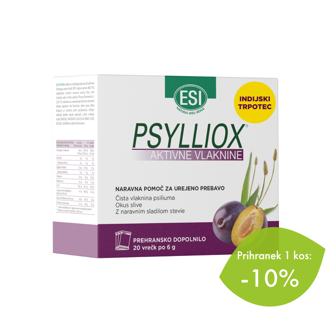 Kako deluje? Lupina semen indijskega trpotca ali psiliuma vsebuje visok odstotek sluzi, ki spadajo med topne vlaknine. Te se ob stiku z vodo povečajo za kar 25-krat in ustvarijo naraven gel, ki poveča in zmehča blato ter poveča njegov volumen in omogoča lažje odvajanje, s čimer očisti črevesje. Prav tako deluje blažilno in pomirjujoče na prebavni sistem. Vlaknine psiliuma imajo tudi prebiotični učinek. Pripomorejo k ohranjanju zdravega črevesja in lajšanju črevesnega tranzita.