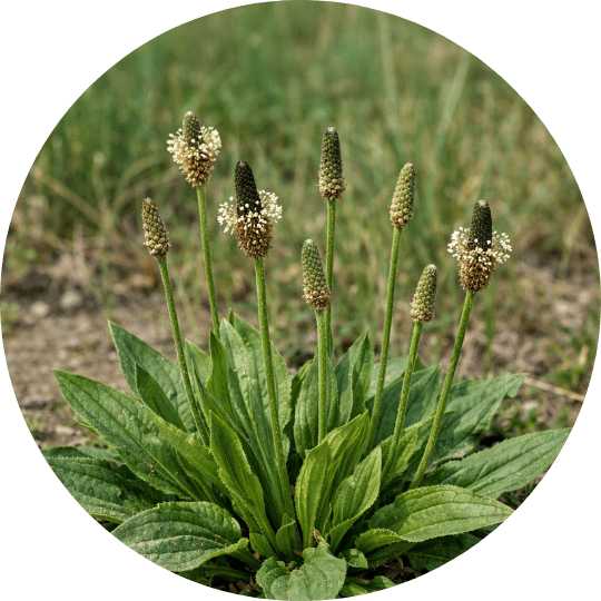 vsebuje tanine, flavonoide in aukubin, ki deluje protivnetno, antialergijsko in pomaga pri izkašljevanju.